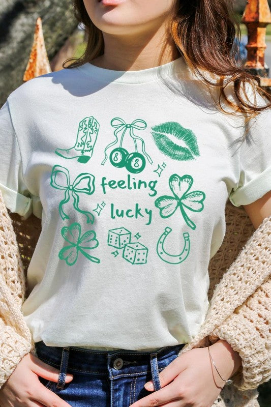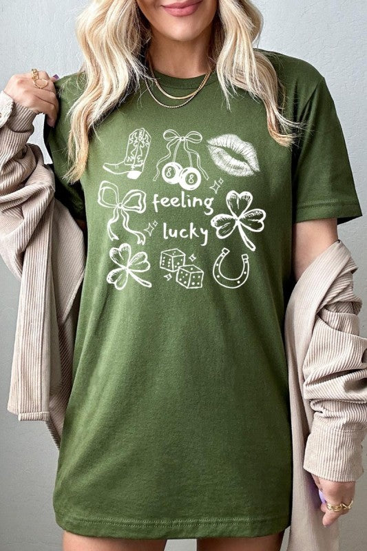 feeling lucky tee, lucky icons graphic shirt, clover horseshoe tee, st patricks day top, green festive graphic, boutique spring Graphic Tee.