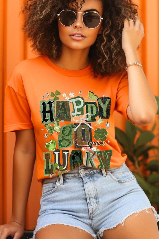happy go lucky tee adult, clover graphic shirt, lucky theme tee, st patricks graphic adult, boutique novelty top