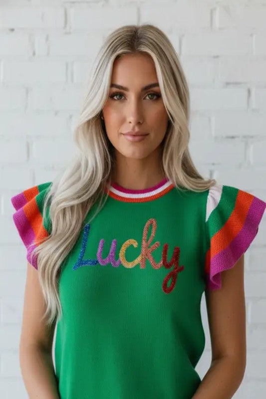 Celebrate the season in style with this vibrant sweater that brings instant cheer to your wardrobe. Colorful striped flutter sleeves flutter with playful energy, while a shiny \"Lucky\" text catches the light with every move. Crafted from soft, cozy knit fabric, it's the perfect pick for St. Patrick's Day festivities or casual spring adventures. Dress it up or down, pair with jeans for laid-back vibes or pants for a polished look. Fun, comfortable, and undeniably lucky. Viscose/Polyester/Poly